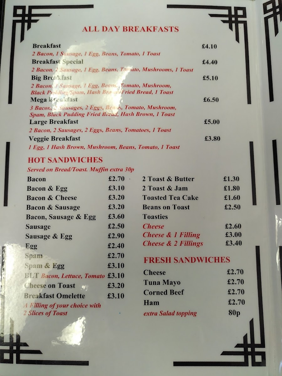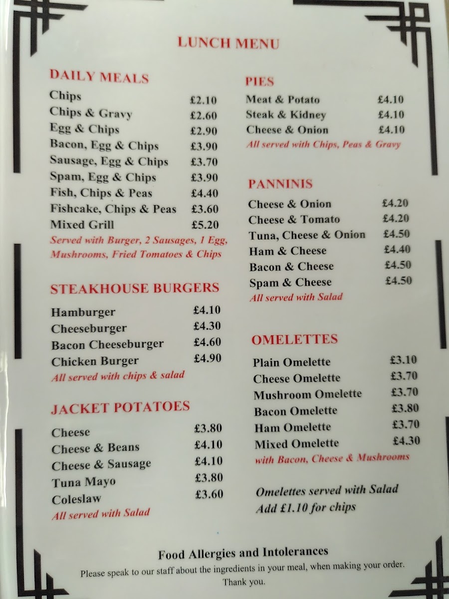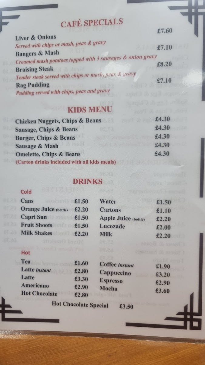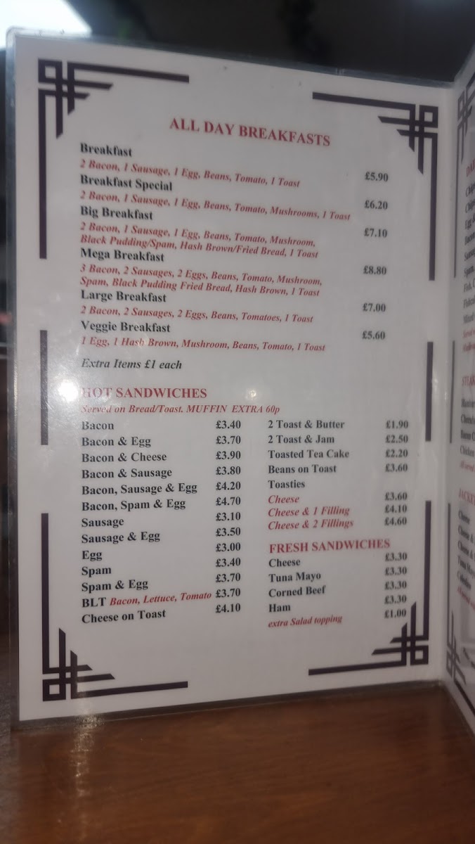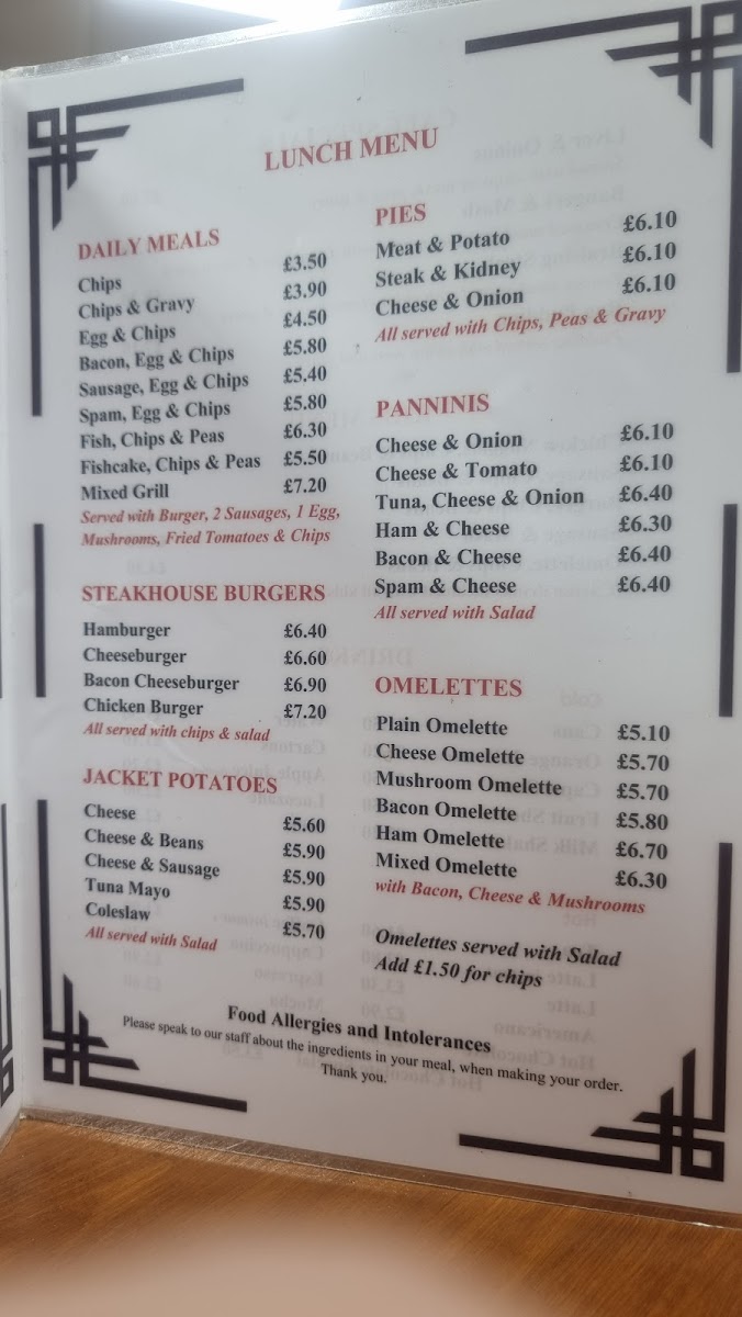 The cafe specializes in classic British comfort food, with a menu that features mouthwatering options such as Jacket Potatoes loaded with your choice of cheese, beans, or the savory tuna mayo. For those with a penchant for pastry, their selection of Pies like the beloved Meat & Potato or Steak & Kidney is perfect for a filling meal. Not to forget, their array of Omelettes—from the classic Plain Omelette to the hearty Bacon Omelette—makes for an excellent choice any time of the day.